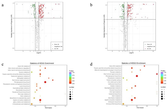 Volcano plots for S19-S2 vs. BS-S2 and S19-S4 vs. BS-S4 (a,b), KEGG pathway enrichment for S19-S2 vs. BS-S2 and S19-S4 vs. BS-S4 (c,d).