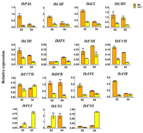 Flavonoid biosynthesis is an extremely complex pathway that entails the phenylpropane synthesis pathway and a range of secondary pathways including the flavonoid and anthocyanin metabolic pathways. To more fully explore the molecular basis for the observed differences in flavonoid- and flavor-related metabolites in these samples, qPCR analysis was next used to profile the expression of key flavonoid metabolism-related genes (Figure 5). The expression of PAL, C4H, 4CL, CHS, CHI, IFS, F3H, F3’H, DFR, ANS, ANR, FLS, UTG, and FNS in BS was higher than that in S19, and the difference between PAL and F3′H levels was the most significant. In BS-S2 and BS-S4, the PAL expression levels were 10.98 and 4.15 times that of S19, and F3’H expression levels were 3.38 and 6.93 times that of S19, respectively, while the expression of both PAL and F3’H decreased with the expansion of sweet potato root, which was consistent with the phenotypic data. However, the expression level of FLS was completely opposite to the phenotype (Figure 2a). The expression level of S19 in S2 and S4 was higher than that of BS, which was increased by 4.76 times and 20.66 times, respectively.