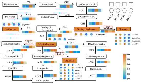Differential metabolites associated with flavonoid biosynthesis and the gene expression network map (S19-S2, S19-S4, BS-S2, and BS-S4).