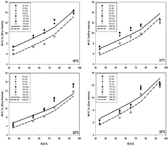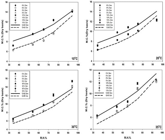Isotherm of CanMa with different dockage percentages (0, 5, 10, and 15%) under desorption and adsorption conditions and at different environmental conditions (temperature: 10, 20, 30, 35 °C; and RH from 34 to 94%) generated by salt solutions. In the graph, the line shows the value predicted by the developed GAB equation and different symbols show the measured values with different dockage percentages. In the legend, Des = desorption, and Sor = sorption.