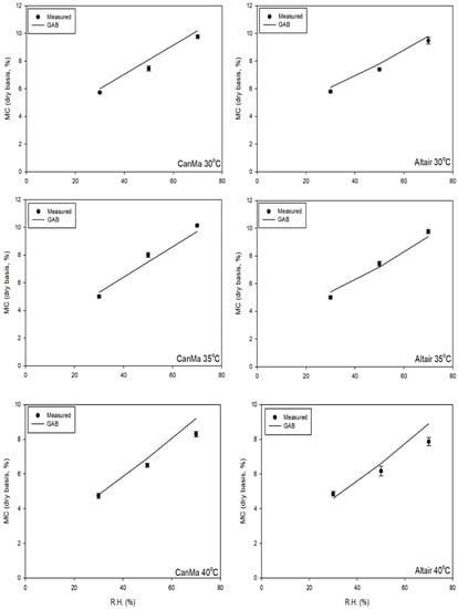 The EMC obtained for both varieties using the thin-layer method was higher than that determined by the SSS method at the same temperature and RH (Figure 1, Figure 2 and Figure 3). It varied by 0.5% on average. Both varieties had the same EMC at 40 °C and 30% RH (4.5 ± 0.0%). The EMC of Altair and CanMa was 8.2 ± 0.1% and 8.1 ± 0.1%, respectively, at 30 °C and 70% RH, which is not significantly different. Therefore, CanMa had a similar EMC as Altair (minimum 0.1% difference) under the same drying condition when the temperature was lower than 35 °C.