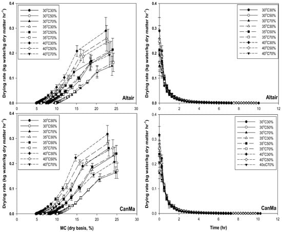 During drying, only the falling rate period was observed for both varieties (Figure 4). Both varieties showed the first and second falling rates of drying. For both varieties, the maximum drying rate was around 0.2 to 0.3 kg water per kg dry matter per hr at 40 °C at 30% RH, and the drying rate was lower than 0.1 kg kg−1 h−1 for the second falling rate when the seeds had a lower than 13% MC (Figure 4). When the temperature was lower than 35 °C, both varieties had a drying rate lower than 0.2 kg kg−1 h−1. The maximum drying time was over 10 h (Figure 4).