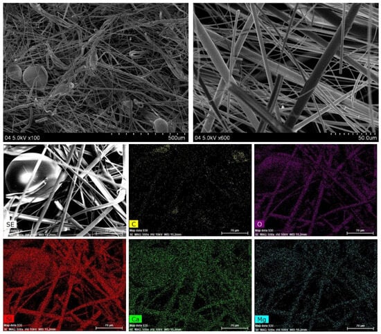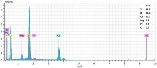 According to the scanning electron microscopy images, elemental mapping, and EDS spectra of rockwool shown in Figure 1 and Figure 2, it can be seen that rockwool has a fibrous structure and contains irregular spindles inside, which are mainly composed of C4+, O2−, Si4+, Ca2+, and Mg2+, among which the O2−, Si4+, and Ca2+ contents are higher and the C4+ and Mg2+ contents are lower.