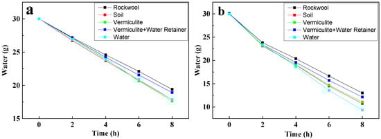 The same thickness of material and the same mass of pure water were placed into Petri dishes, and a high-temperature evaporation experiment was conducted to simulate the water retention capacity of various materials. As shown in Figure 3, at 30 °C, the rockwool contained 19.41 g of water after 8 h of evaporation, the vermiculite substrate with a water retention agent added had 18.92 g of water remaining, and the amounts of water remaining in the Petri dishes of pure vermiculite substrate, pure soil, and pure water were 17.66, 17.86, and 17.87 g, respectively. At 40 °C, evaporation was faster in the first 2 h because of the high surface moisture of each material, but after that the decline of the residual moisture was linear up to 8 h. At 8 h, rockwool was the best water retention material with 13.01 g of water remaining, followed by vermiculite matrix with a water retention agent added with 12.13 g of water remaining, pure vermiculite matrix with 11.07 g of water remaining, pure soil with 14.50 g of water remaining, and pure water with 9.35 g of water remaining. This experiment demonstrated that rockwool had the best water retention capacity, followed by vermiculite substrate with a water retention agent, and pure soil had the worst water retention capacity. The higher the temperature, the more significant the water retention capacity of rockwool.