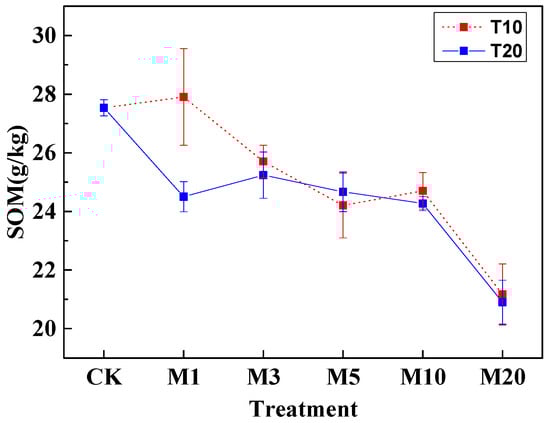 Soil organic matter (SOM) alters the physicochemical reactions that affect the active composition of micronutrients [,]. As shown in Figure 4, the SOM content tended to decrease as the rockwool content in the soil increased, but the particle size of rockwool had no significant effect on the SOM content. This suggests that the increase in rockwool content has an effect on the normal activities of earthworms, thereby decreasing the degree of soil fecalization and thus the SOM content. However, the SOM content was slightly increased at low concentrations of 10% rockwool, indicating that rockwool at that concentration could be used as an additive to change the soil interstices without affecting the activities of earthworms.