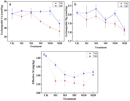 As shown in Figure 5a,b, as the content of rockwool in soil increased, the calcium and magnesium content in soil exhibited a decreasing trend, but the change in calcium and magnesium content only differed significantly at the highest rockwool concentration. The effect of 20-mesh rockwool on the calcium–magnesium–silica content of soil was smaller than that of 10-mesh rockwool. This indicates that the increase in rockwool content has little effect on the calcium and magnesium content in soil. As shown in Figure 5c, the concentration content of rockwool in the soil has a large effect on the effective silicon content in the soil. After the addition of rockwool, the effective silica content in the soil was showed a decreasing trend compared to the blank control. The decrease of 10-mesh rockwool was 7.25~17.10%, and the decrease of 10-mesh rockwool was 15.22~23.42%.