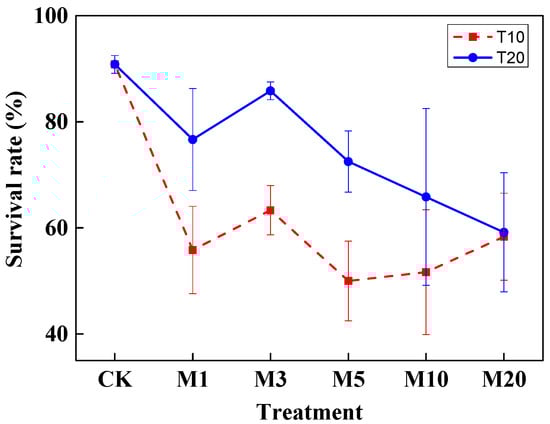 From Figure 6, it can be seen that the survival rate of earthworms decreased after the addition of 10% rockwool, but there was no significant change in the survival rate of earthworms with the increase in the amount of rockwool. After the addition of 20% rockwool, the survival rate of earthworms decreased gradually with the increase in the amount of rockwool, and the lowest survival rate was 59.17% with the addition of 20% rockwool. However, the lowest earthworm survival rate after the addition of powdered rockwool was still higher than that after the addition of most granular rockwool, indicating that the size of rockwool had a significant effect on the survival rate of earthworms, and the larger the granules, the lower the survival rate of earthworms. The possible reason for this is that the granular rockwool (10-mesh) is more irritating to earthworms.