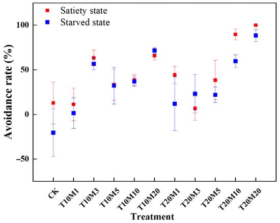 Earthworms exhibit rejection behaviors for unfavorable soil, and different behavior patterns when they are satiated and starved. As can be seen from Figure 7, when the rockwool consisted of large particles and the concentration was 10 g/kg and below, i.e., under low-concentration conditions, the earthworm avoidance rate was less than 20% and the avoidance behavior was not obvious, and the pollutant probably had no obvious toxic effect on the earthworms and did not constitute pollution stress. With the addition of rockwool, the avoidance behavior of earthworms gradually became obvious, indicating that the coercive effect of rockwool on earthworms gradually increased with an increasing amount of rockwool. There was no significant difference between the avoidance rate of earthworms in the satiated and starved states.