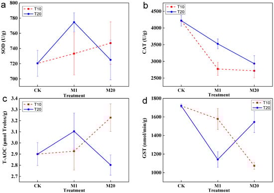 Changes in the activities of SOD (a), CAT (b), T-AOC (c), and GST (d) of earthworm tissues in different treatments.