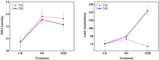 Changes in MDA and AchE contents of earthworm tissues in different soil additions.