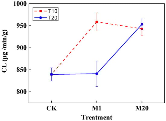 CL is an important digestive enzyme that directly affects the ability of earthworms to break down plant litter and other cellulosic material and is therefore widely used as a biomarker to detect the effects of pollutants on earthworms [,]. As can be seen from Figure 11, compared with CK, there was a significant increase in CL content in all treatments except for under the low concentration of 20-mesh powdered rockwool, indicating that the earthworm bodies in these groups produced higher CL content in their tissues to obtain more energy to survive to obtain sufficient nutrients. KIM S study found that earthworms had upregulated cellulase activity after attack by LPS, Gram-negative, or Gram-positive bacteria []. This finding showed that the 10-mesh granular rockwool and the high concentration of 20-mesh powdered rockwool had an effect on the survival of earthworms.