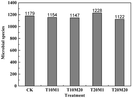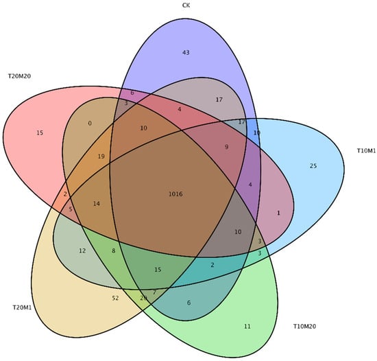 The microbial composition of the earthworm gut varied among treatments at the species level (Figure 12), with 1016 microorganisms common to each treatment and 43, 25, 11, 52, and 15 microorganisms unique to the six treatments CK, T10M1, T10M20, T20M1, and T20M20, respectively. This indicated that the addition of rockwool changed the microbial composition of the earthworm gut. In addition, 43 unique microbial communities were observed in CK, indicating that these microorganisms were sensitive to rockwool addition. From Figure 13, it can be seen that the more rockwool added, the fewer the microbial species, and the smaller the rockwool particle size, the more microbial species. This demonstrated that a small amount of small-particle-size rockwool had an elevated effect on the earthworm gut microorganisms. This may have been due to the fact that a small amount of small-particle-size rockwool had less of an effect on earthworms, but had a greater effect on the gut microorganisms due to the lower concentration and no decline in microbial species, but an increase in species for self-protection.