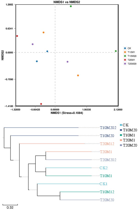 In terms of beta diversity analysis (Figure 14), non-metric multidimensional scaling suggested the separation of T10M20 and the remaining four groups of treated specimens, indicating that the addition of large particle sizes and a high concentration of rockwool resulted in significant changes in the structure of the earthworm gut microbial community. This finding was consistent with the previous results of enzyme activity analysis. According to the hierarchical clustering tree, the clusters of T10M20 were significantly separated from the clusters of the remaining four groups of treatments. The clusters of CK, T10M1, T20M1, and T20M20 were grouped together.