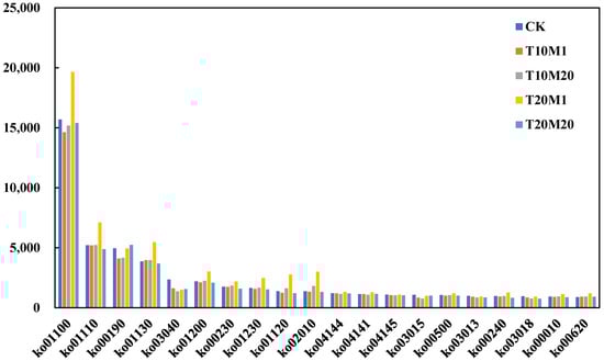 The highest abundance of ko01100, ko01110, ko00190, and ko01130 in the Kyoto Encyclopedia of Genes and Genomes (KEGG) metabolic pathway is shown in Figure 15, where ko01100, ko01110, and ko01130 belong to the global and overview maps of the secondary metabolic pathway and ko00190 belongs to the energy metabolism secondary metabolic pathway. The abundances of most metabolism-related pathways were higher in the T20M1-treated soils than in the remaining treatments, while there was no significant difference between the remaining treatments.