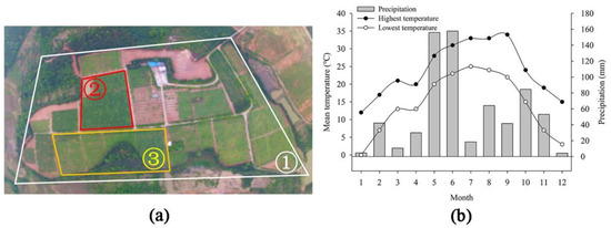 Aerial view and meteorological conditions of the study area in 2021. (a): Aerial view of the orchard. The numbers represent the total area of the orchard (1), the planting area of ‘Jinkui’ kiwifruit (2), and the planting area of ‘Hort-16A’ kiwifruit (3), respectively. (b): Meteorological conditions of the study area in 2021.