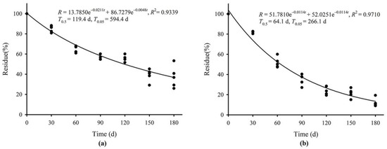 Litter decomposition rate of ‘Jinkui’ and ‘Hort-16A’ kiwifruit. (a): ‘Jinkui’ kiwifruit. (b): ‘Hort-16A’ kiwifruit.