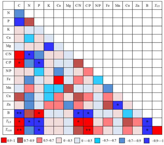 Correlations between initial nutrient concentration and decomposition rate of kiwifruit litter. Red represents a positive correlation, blue represents a negative correlation. The darker the color represents the stronger the correlation. *: p < 0.05; **: p < 0.01.