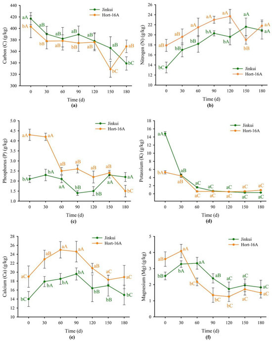 Dynamics of macro-elements during kiwifruit litter decomposition. (a): Dynamics of C concentrations; (b): dynamics of N concentrations; (c): dynamics of P concentrations; (d): dynamics of K concentrations; (e): dynamics of Ca concentrations; (f): dynamics of Mg concentrations. Different uppercase letters indicate significant differences in decomposition time, and different lowercase letters indicate significant differences in cultivars (p < 0.05).