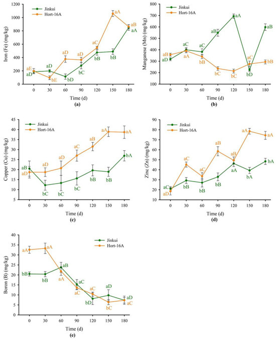 Dynamics of micro-elements during kiwifruit litter decomposition. (a): Dynamics of Fe concentrations; (b): dynamics of Mn concentrations; (c): dynamics of Cu concentrations; (d): dynamics of Zn concentrations; (e): dynamics of B concentrations. Different uppercase letters indicate significant differences in decomposition time, and different lowercase letters indicate significant differences in cultivars (p < 0.05).