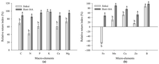 Relative return index during kiwifruit litter decomposition. (a): The relative return indexes of macro-elements; (b): the relative return indexes of micro-elements. Different lowercase letters indicate significant differences in cultivars (p < 0.05).