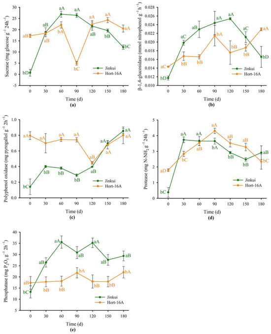 Dynamic trend of soil enzyme activity in the decomposition process of kiwifruit litter. (a): Sucrase; (b): β-1,4-glucosidase; (c): polyphenol oxidase; (d): protease; (e): phosphatase. Different uppercase letters indicate significant differences in decomposition time, and different lowercase letters indicate significant differences in cultivars (p < 0.05).