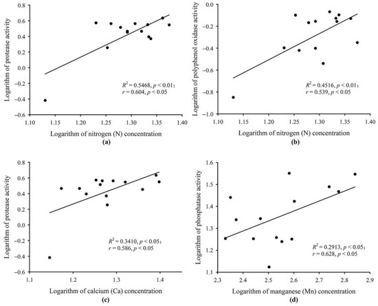 The relationship between the N concentration and protease activity was positively correlated (Pearson correlation coefficient, r = 0.604, p < 0.05) (Figure 8). Moreover, the relationship between the N concentration and polyphenol oxidase activity was positively correlated (r = 0.539, p < 0.05). The relationship between the Ca concentration and protease activity was positively correlated (r = 0.586, p < 0.05). The relationship between the Mn concentration and phosphatase activity was positively correlated (r = 0.628, p < 0.05).
