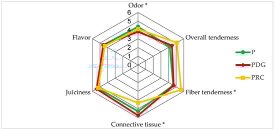 Spider web chart with mean sensory scores from QDA® of meat samples from three dietary treatments: P (pasture only), PDG (pasture plus distiller grains and dry-rolled corn) and PRC (pasture plus dry-rolled corn) evaluated by an eight-member trained panel. The data shown are means of the scores given by an eight-member panel over a 10 cm scale. For clarity, data are plotted up to 6 cm. Notations: * indicates significance at a p-value < 0.05.