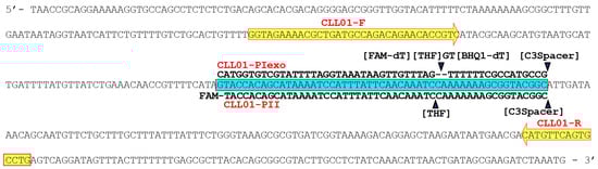 | CL001-PII | FAM-TACCACAGCATAAAATCCATTTATTCAACAAATC [THF]CAAAAAAAGCGGTACGGC [C3Spacer] |