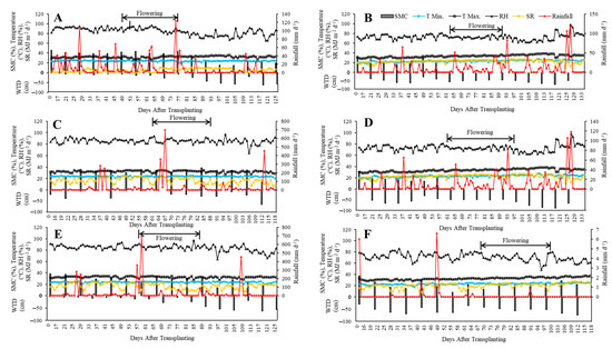 Weekly soil moisture content (SMC) and water table depth (WTD), and daily, maximum and minimum temperatures, RH, solar radiation (SR), and rainfall in the rainfed and controlled-drought field conditions from transplanting to harvesting. Left side, (A,C,E), rainfed conditions of the 2019 WS, 2020 WS normal planting, and 2020 WS late planting, respectively; right side, (B,D,F) controlled-drought conditions of the 2020 DS mild drought, 2020 DS severe drought, and 2021 DS mild drought.