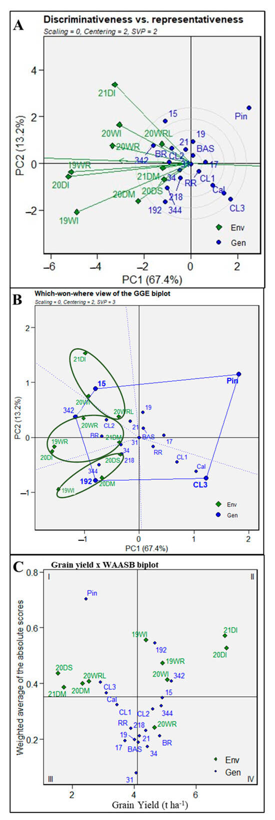 Biplot view for the discriminativeness vs. representativeness (A), which-won-where (B), and grain yield x weighted average of the absolute scores (C), across the water treatments. Green diamonds represent the treatment or environment in the year–season–water treatment combination. In the treatment labels, 19, 20, and 21 indicate the years, namely 2019, 2020, and 2021, respectively; D and W denote the dry and wet season, respectively; the last letters represent the water treatments: I—irrigated, R—rainfed, RL—rainfed-late, M—mild drought, and S—severe drought. Blue circles or diamonds represent genotypes. For the released varieties with NSIC codes, the suffix numbers were retained, e.g., 192 for the drought-tolerant check variety NSIC Rc192. For the other genotypes, BR—Black rice, RR—Red rice, Cal—Calatrava, Pin—Pinilisa, BAS—Basmati, CL1—CLRice-1, CL2—CLRice-2, and CL3—CLRice-3. In discriminativeness vs. representativeness, lines connecting water treatments to the biplot origin are called environment vectors. In which-won-where, dashed line means sectors of convex hull, polygon blue line is the convex hull, while green ellipse shape represents the so-called megaenvironment.