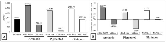 Average net income (ha−1) for specialty rice with the highest and lowest grain yield (A), and their comparative net income relative to the drought-tolerant (DT) check variety (NSIC Rc192) (B), under rainfed conditions in the 2019 and 2020 wet seasons (WS). The market prices for milled rice were set to USD 0.91 (PHP 45.00 kg−1) for the drought-tolerant check variety [65], USD 1.46 (PHP 72.00 kg−1) for aromatic rice, USD 1.56 (PHP 77.00 kg−1) for pigmented rice, and USD 1.20 (PHP 59.00 kg−1) for glutinous rice [21].