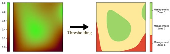 Precision agriculture relies on new technologies and various data to help us better understand the soil structure and facilitate soil testing by carefully selecting a small number of sites to test the soil [6]. This method increases crop yield and profitability while lowering the levels of traditional inputs needed to grow crops, such as fertilizers [7]. One of the most popular approaches in precision agriculture encompasses soil sampling within management zones and site-specific crop management [6]. In employing this method, a field is divided into several management zones (MZs), which are relatively homogeneous sub-units of a farm field that can each be treated uniformly. The MZs are usually delineated by a multilevel thresholding method (henceforth, simply referred to as thresholding) on a performance function across the field (e.g., historical yield). Figure 1 shows an example of a performance function across the field and how thresholding this function makes the MZs. By establishing MZs, each MZ is considered homogeneous in the composite soil sampling method. A composite sample is done per MZ, which lowers the cost of testing compared to grid sampling by reducing the number of tests.