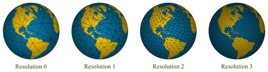 A DGGS is a multi-resolution discretization of the earth that is used to address different limitations in traditional GISs [29,30,31]. Our automated algorithm leverages some of the benefits of DGGSs. We use a DGGS as a common reference model to integrate the different data needed for selecting the sampling site, including satellite imagery and digital elevation models (DEMs) [32]. A DGGS not only facilitates the analysis by making the data integration transparent but also by providing efficient tools and operations including distance transform [33]. Distance transform is a tool that can be used to efficiently calculate the geodesic distance of all the points of a region to the complex boundary of the MZs. A DGGS naturally discretizes the earth into mostly regular shapes known as cells. Figure 2 depicts this discretization at different resolutions. The specific DGGS implementation that is used in this work is a Disdyakis Triacontahedron DGGS, which is described in [34].