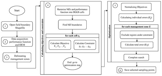 Our automated process of selecting benchmark sites for a field is presented in Figure 4 in six steps. The process starts by loading the boundary of the field in step 1. In step 2, the performance function and DEM are loaded either by downloading them or loading them from a local cache. Step 3, constructs the MZs from the performance function for step 4. The main contributions of this paper are in steps 4 and 5. In step 4, first, MZs, performance function, and DEM data are resampled into DGGS cells at the target resolution, which means that, for each DGGS cell, we know what the MZ, performance function value, and elevation are. Next, we compute all of the objectives and constraints and store them back in the DGGS cells. All of the objectives are computed on the centroid of DGGS cells. In step 5, the objectives are normalized and combined in a single error function to solve the optimization problem. A complete search in DGGS cells finds the optimum benchmark site. Lastly, in step 6, the selected benchmark sites are saved in a GeoJSON format.