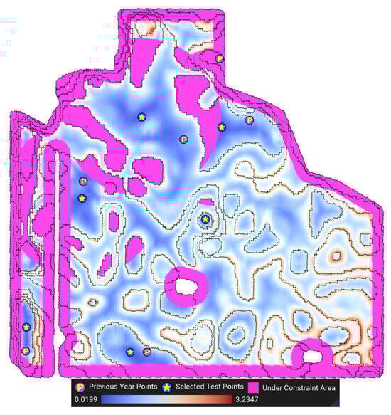 - By using this method, the benchmark sites selected earlier have an advantage over the ones chosen later, as the latter are subject to more constraints. If the is small, the change of order has a minimal impact. However, for a larger , it makes sense to prioritize MZs according to their level of importance. Therefore, we start with the most important MZ in order to find a more optimal benchmark site for it, and then we continue to select benchmark sites for less important MZs. The most important MZ is the one that best represents the entire field. Hence, the most important MZ is the one with its median F-index closest to that of the entire field. We sort the MZs based on the distance of their median F-index to the median F-index of the entire field. The radius mentioned above can be dynamically changed, but the default is set to be 15% of the field’s diameter. Figure 12 shows how we use this radius to force the selected benchmark sites to be at a reasonable distance from each other.