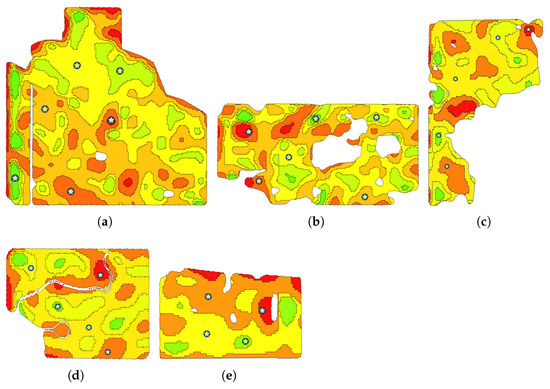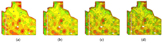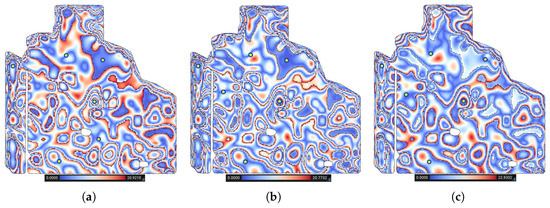 Figure 14 shows the final error function only for feasible search space considering constraints for all MZs. The order of the MZ optimization in this figure is MZ 4, MZ 3, MZ 5, MZ 2, MZ 6, and lastly MZ 1. The areas under the headland constraint () and distribution constraint () are marked in pink.