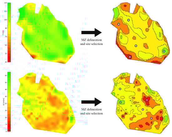 - Mazur, P.; Gozdowski, D.; Wójcik-Gront, E. Soil Electrical Conductivity and Satellite-Derived Vegetation Indices for Evaluation of Phosphorus, Potassium and Magnesium Content, pH, and Delineation of Within-Field Management Zones. Agriculture 2022, 12, 883. [Google Scholar] [CrossRef]