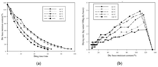 Figure 2a shows that with an increase in the hot-air temperature, the drying curve of extruded cotton stalks becomes steeper; that is, the greater the hot-air temperature, the shorter the drying time required. From Figure 2b, it can be seen that the acceleration process of the hot-air drying process for cotton stalks is not obvious, and the water-loss process is mainly concentrated in the slow drying stage. Moreover, the drying rate during the entire drying stage was greatly affected by wind temperature; the higher the hot-air temperature, the greater the drying rate. But the distance between the two curves at 90 °C and 100 °C varied less than that of the two curves at other temperature ranges.