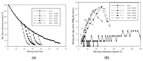 The hot-air speed and loading capacity were 3.8 m s−1 and 150 g, respectively, the initial moisture content of the extruded cotton stalks was about 140% (dry base), and the hot-air temperature and microwave power were 80 °C and 700 W, respectively. Under these conditions, the drying curve and the drying rate curve of extruded cotton stalks for different moisture content at the conversion point are shown in Figure 3.