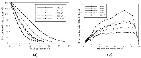 Drying curves and drying rate curves at various microwave power levels (a) Drying curve (b) Drying rate curve.