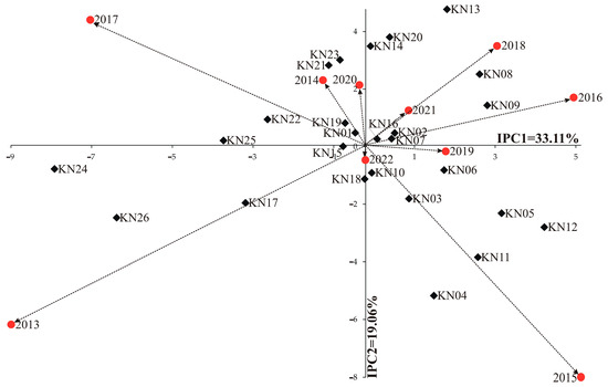 The AMMI2 biplot (Figure 1) shows the stability of genotypes (lines) and environments (years), as well as specific GEIs. Among the tested DH lines, the line KN12 had the highest IPCA 1 value of 4.431, while the lowest value of IPCA 1 was –7.709 for KN24 (Table 5, Figure 1 and Figure 6). IPCA 1 values for years (IPCA e1) varied from –8.782 (in 2013) to 5.339 (in 2015). IPCA 2 values for genotypes (IPCA g2) varied from –5.229 (for line KN04) to 4.722 (for line 7) (Table 5, Figure 1 and Figure 7). Meanwhile, IPCA g3 varied from –4.964 (for line KN23) to 4.438 (for line KN17) (Table 5). IPCA e2 values varied from –8.047 (in 2015) to 4.354 (in 2017) (Table 5, Figure 1 and Figure 7). However, IPCA e3 values varied from –5213 (in 2015) to 6.259 (in 2016) (Table 5). The stability of the tested lines can be assessed by the biplot for 1000-kernel weight (Figure 2). The DH lines responded differently to climatic conditions during the test years. The lines KN03 and KN04 adapted in environments with similar conditions to those in 2015 (a very dry year) and did not adapt in 2017. Line KN09 adapted in environments with similar conditions to these in 2018 (a very hot year) and did not adapt in 2013. Line KN21 adapted in environments with similar conditions to those in years 2014 and 2020 (the rainiest years among those considered in the experiment) and did not adapt in 2015 (Figure 1 and Figure 6). ASV revealed variations in 1000-kernel weight stability among the 26 DH lines (Table 5). According to Purchase et al. [82], a stable line is defined as one with an ASV close to zero. Consequently, the lines KN16 with an ASV of 0.544, KN01 with an ASV of 0.617, KN15 with an ASV of 0.967, and KN10 with an ASV of 0.998 were the most stable (Table 5, Figure 1 and Figure 6), while the lines KN24 (ASV equal to 13.419) and KN26 (ASV equal to 11.011) were the least stable (Table 5, Figure 1 and Figure 6). Lines KN07 and KN10, with a high average 1000-kernel weight (354.1 g and 346.6 g, respectively) and the ASV equal to 1.142 and 0.998, respectively, had the best genotype selection indices (7 and 13, respectively) (Table 5). However, the lines KN08 and KN25 had the worst genotype selection indices (43 and 40, respectively) (Table 5).
