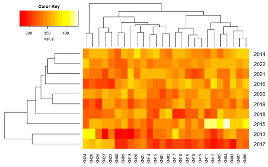 The results of the field trials demonstrated the impact of weather conditions, environment (year), and genotypes on the 1000-kernel weight of the maize doubled-haploid lines. The 1000-kernel weight of the tested DH lines varied from 275.1 g (for KN13 in 2013) to 433.0 g (for KN04 in 2015) throughout the ten years, with an average of 343.7 g (Table 5, Figure 2). The average 1000-kernel weight per genotype varied from 330.9 g (for KN08) to 356.5 g (for KN06) (Table 5, Figure 3). The relationships between the DH lines are presented in the form of a dendrogram (Figure 3), in which three clusters were clearly distinguished. The first cluster contains five DH lines: KN22, KN23, KN24, KN25, and KN26; the second (eight DH lines) cluster contains: KN01, KN10, KN11, KN12, KN13, KN14, KN15, and KN17; and the third cluster contains the other 13 DH lines (Figure 3). The average 1000-kernel weight per year also varied from 322.0 g in 2017 to 360.0 g in 2015 (Table 5, Figure 4). The relationships among years of study are presented in the form of a dendrogram (Figure 4), in which three clusters were clearly distinguished. The first cluster contains two years, namely 2019 and 2020; the second (three years) cluster contains 2013, 2014, and 2017; and the third cluster contains the other five years of study, namely 2015, 2016, 2018, 2021, and 2022 (Figure 4). The highest variability (the coefficient of variation is equal to 15.50%) in the 1000-kernel weight of maize was observed in the first year of conducting the study (2013). In contrast, the lowest variability in the 1000-kernel weight was observed in 2020 and 2022 (7.27% and 7.65%, respectively) (Figure 5).