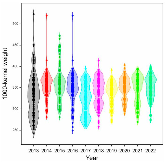 The main factors influencing the 1000-kernel weight are genetics and environmental conditions [30,31,32,33]. Weather and soil conditions play a crucial role in yield and kernel weight [34]. Effective agronomy practices, such as proper fertilization, pest and disease control, as well as optimal planting density and timing, can influence kernels’ weight growth [35,36,37,38].