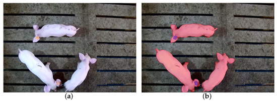 The PaddleSeg [20] open-source image annotation software (Version 2.7, licensed under the Apache License 2.0) was used to annotate the breeding pig and ear tag regions. The annotations were stored in the COCO dataset [21] format. The original image is shown in Figure 2a, while the annotated result is shown in Figure 2b. In the annotated image, the semi-transparent red regions represent the breeding pigs, and the semi-transparent purple regions represent the ear tags. Specifically, there are two breeding pigs with ear tags in the image, while one breeding pig is missing the ear tag.