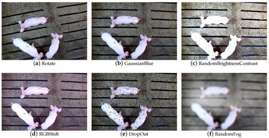 In this study, data augmentation was performed using the Python data augmentation library Albumentations [22] and a single-sample data augmentation approach. The methods include random rotation (randomly generating a rotation angle within the range of −45 to 45 degrees), Gaussian blur (convolution kernel with a size of 5 × 5 and standard deviation of 3.0), contrast adjustment (randomly sampling adjustment factors within the range of 0 to 1), modification of pixel values (randomly modifying RGB channel values between −50 and 50), dropout (with a probability of 0.4 and a size of 7 × 7), and random fog (randomly generating fogging levels within the range of 0.3 to 1). After randomly extracting 15% of the data for data augmentation, the total number of samples expands to 7212 images. The augmented images are shown in Figure 3.