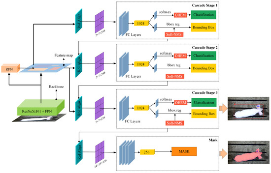 To address the issue of insufficient feature extraction in complex pigsty environments within the Cascade Mask R-CNN, this study utilizes the ResNeXt [16] network as the feature extractor. Additionally, this paper introduces online hard example mining (OHEM) to enhance the model’s ability to learn from challenging samples, effectively tackling the problems of imbalanced dataset categories and uneven distribution of complex and easy samples. Soft-NMS is utilized to enhance instance segmentation performance to mitigate issues caused by dense overlaps of breeding pigs, such as false merges and missed instances due to occlusion. The effectiveness of the algorithm improvements and their usability in a production environment are validated through sliding window detection experiments. The main contributions of this paper are as follows: