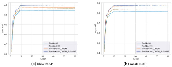 Figure 5 shows the changes in the average accuracy of detection and segmentation throughout the model training. It is evident that the bbox mAP and mask mAP of the model in this study start improving earlier and tend to stabilize after 10 epochs. The maximum values reached are approximately 90% and 88%, close to the test set values of 90.07% and 87.84%, respectively. These results indicate that the model does not exhibit overfitting or underfitting and possesses good generalization ability.