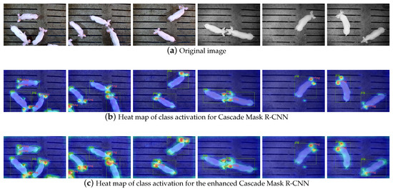 The experiment employed the class-activated heat map [30] to visualize the feature extraction in ear tag recognition. Class activation maps generate heatmaps where warmer colors indicate the regions the model focuses on more attentively.