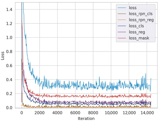 The loss function is crucial in evaluating the model, as it measures the difference between predicted and actual values. In this study, the loss function consists of various components. Firstly, it includes the classification loss () and regression loss () of the Region Proposal Network. Additionally, it estimates the classification loss (), mask loss (), and regression loss () of the cascade detection. The calculation of is made according to binary cross-entropy loss, while is determined using smoothed L1 loss. Similarly, and are computed using pixel-level binary cross-entropy loss, and is calculated using smoothed L1 loss. The overall loss is obtained by taking the weighted sum of these component losses, as shown in Equation (10).