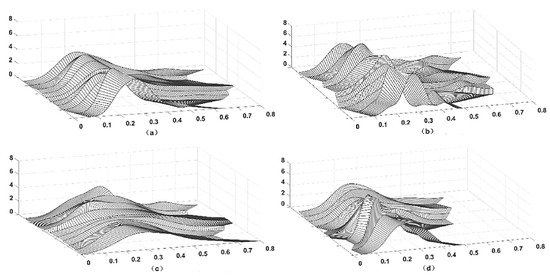 In order to examine the distribution dynamics of the national and three major regions’ agricultural green production level from 2011 to 2021, this paper draws a three-dimensional curve of kernel density using Matlab 2020a software. According to Figure 2a, the position of the main peak of the distribution curve of the national level of green production in agriculture shows a slight shift from left to right. This indicates that the overall level of national agricultural green development has basically changed little. The height of the main peak declines in repeated fluctuations and its width widens. This indicates that the degree of regional development imbalance is increasing. There is a small side peak in the 2011–2014, 2018 and 2020 plots. This indicates that the phenomenon of polarization in the level of green production in the country disappears and then tends to appear gradually. Compared with 2011, the lateral peak of the density curve for the country in 2021 is shifted to the right and extended with a right trailing tail. This indicates that more provinces have higher green production levels as agricultural green development advances.